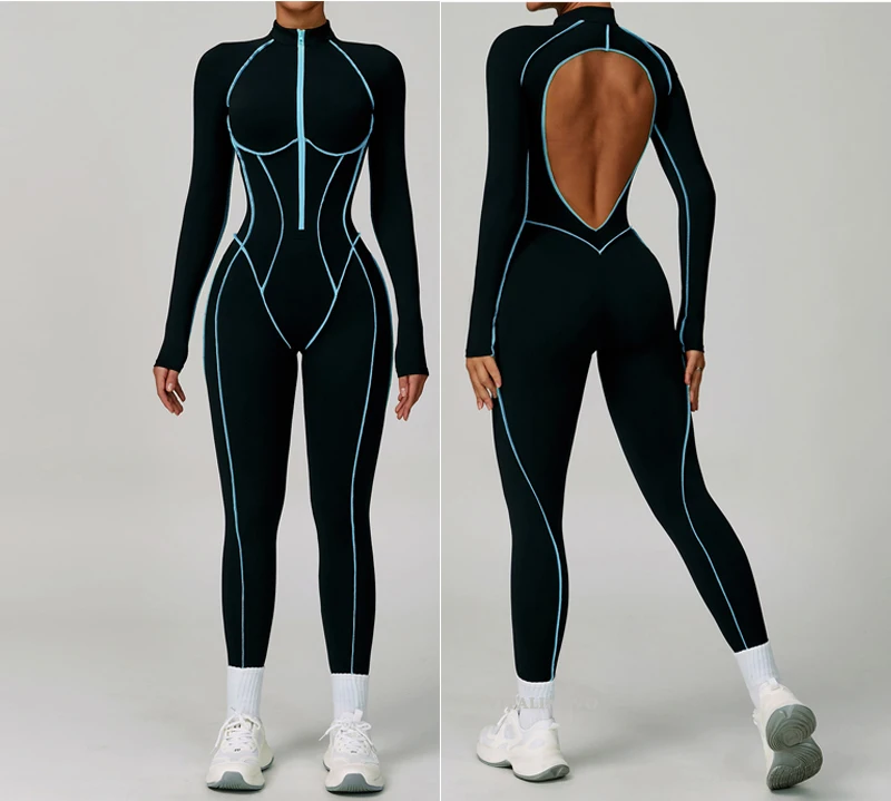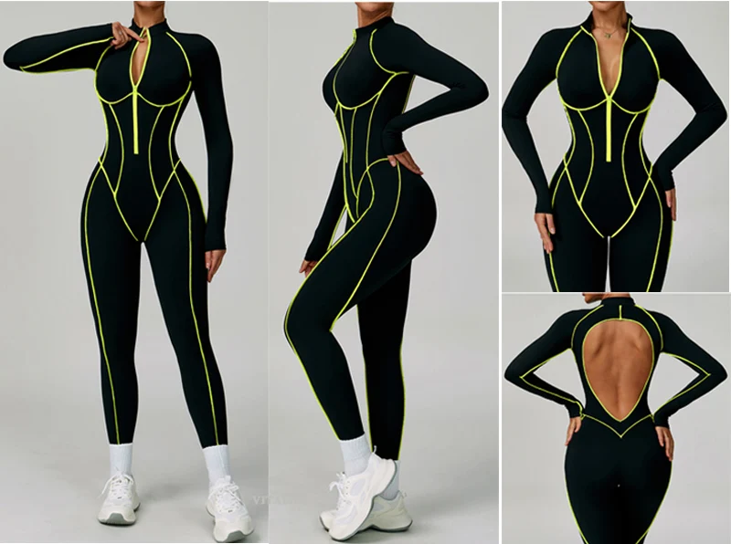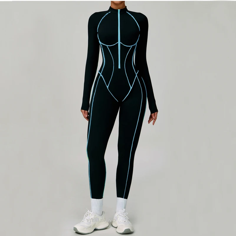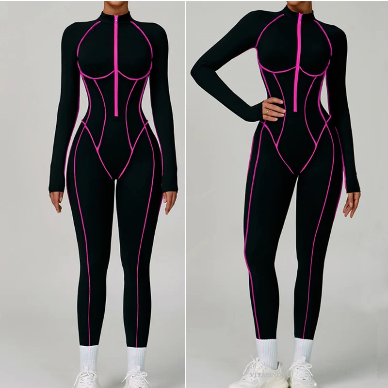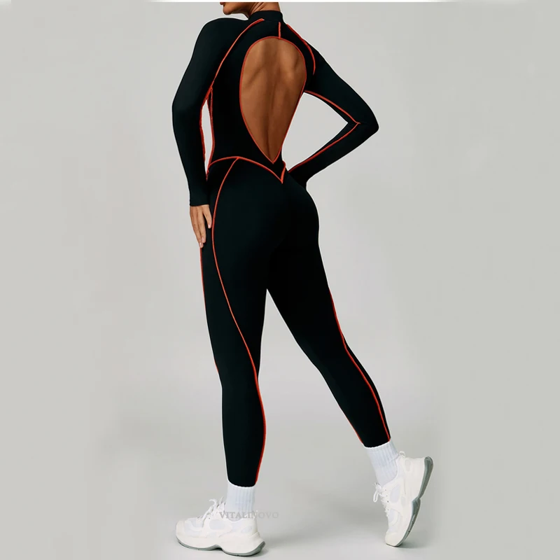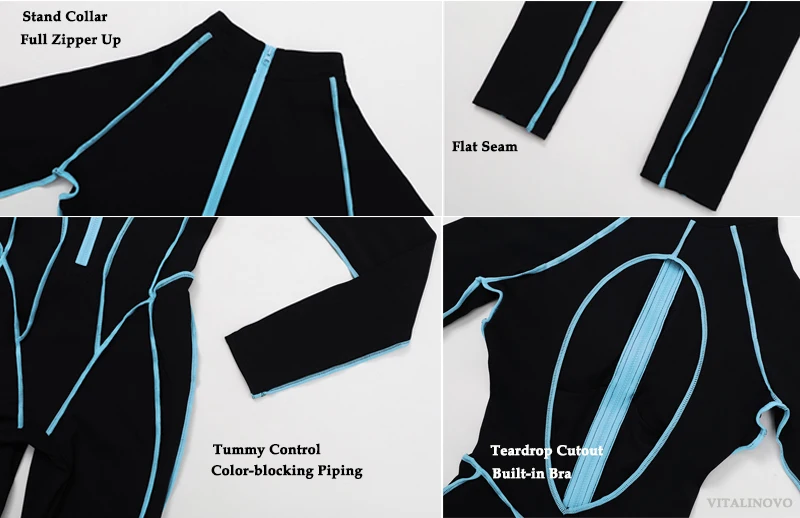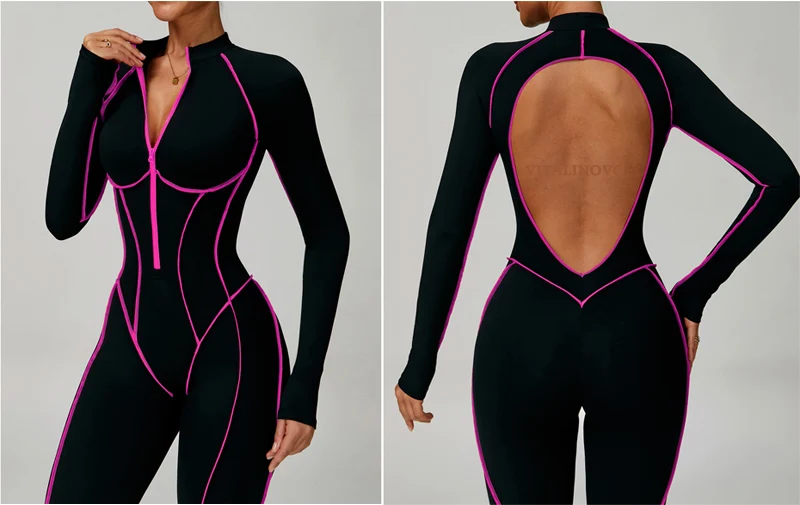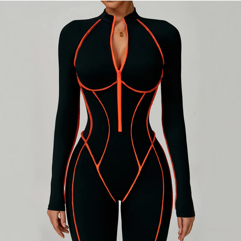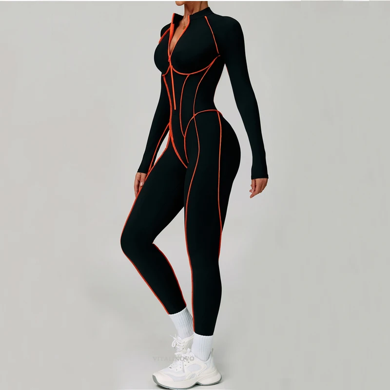 VITALINOVO Women Long Sleeve Workout Jumpsuit Zip Up Romper Bottom Pants Built-in Bra Bodysuit Bodycon Sexy One Piece Colorblock